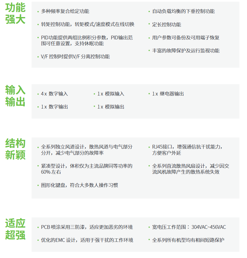 優化的EMC設計,適用于強干擾的工作環境。寬電壓設計,滿足多國電網電壓需求。