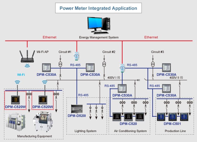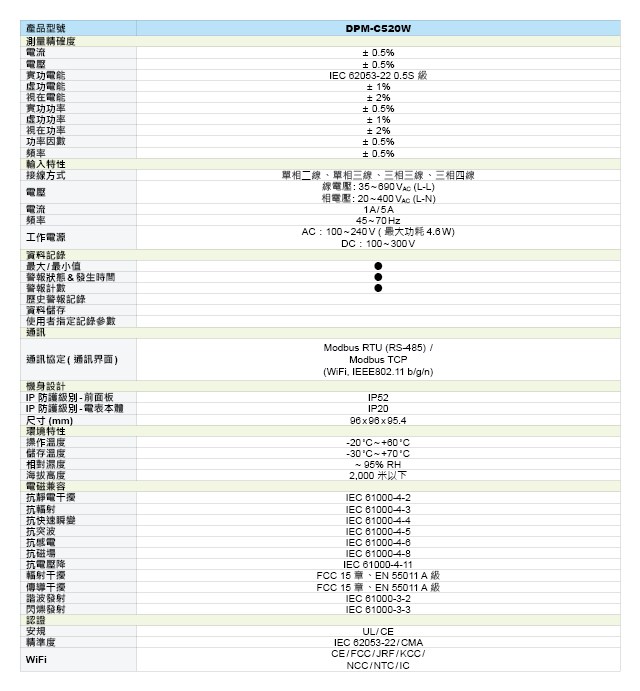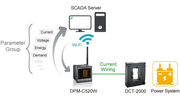 臺達WiFi通訊型多功能電表 DPM-C520W ,使用無線通信技術,非常適合于挑高空間和不易配線的盤體使用。