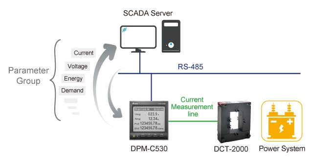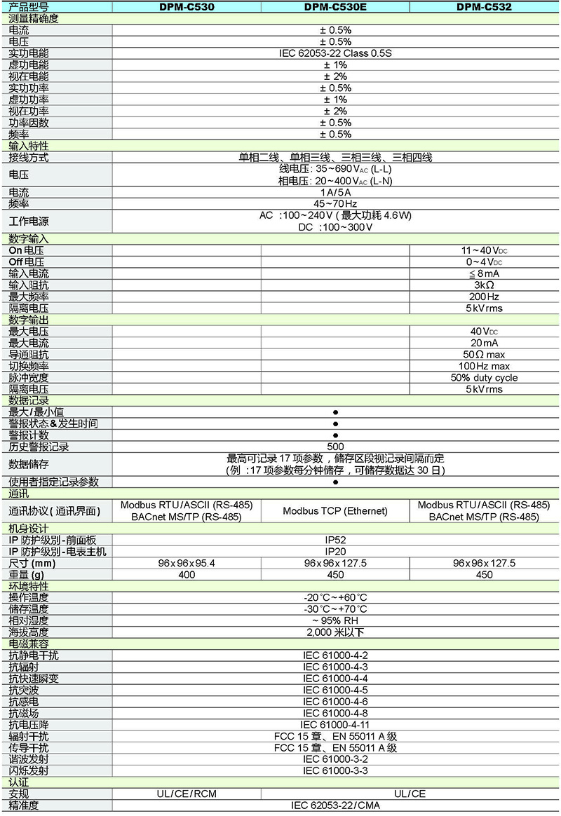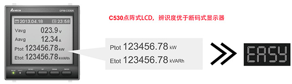 臺達高階型多功能電表 DPM-C530系列 ,可精確的測量各種電力參數及功率因子、諧波、電流電壓不平衡度等電力質量參數、越限警報及數據記錄等功能。