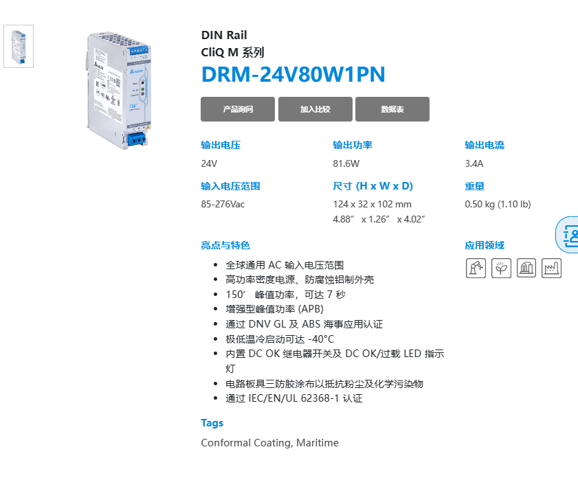 AC 輸入電壓范圍 高功率密度電源、防腐蝕鋁制外殼 150 峰值功率,可達(dá) 7 秒 增強(qiáng)型峰值功率 (APB) 通過 DNV GL 及 ABS 海事應(yīng)用認(rèn)證 極低溫冷啟動(dòng)可達(dá) -40°C 內(nèi)置 DC OK 繼電器開關(guān)及 DC OK/過載 LED 指示燈 電路板具三防膠涂布以抵抗粉塵及化學(xué)污染物 通過 IEC/EN/UL 62368-1 認(rèn)證