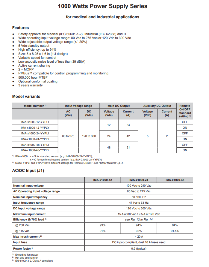 - Wide operating input voltage range: 80 Vac to 275 Vac or 120 Vdc to 300 Vdc
