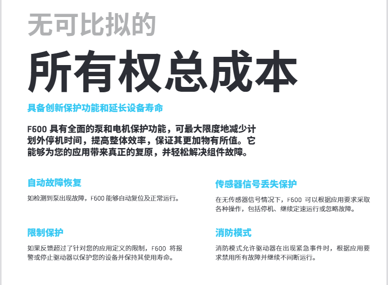 涉及水流的應用,需要極高的可靠性和低能耗。Control Techniques 的F600驅動器隸屬于新推出的行業專用系列,基于我們五十年的驅動專業知識打造,可提供可靠的流量控制。F600驅動器功能齊全,匯集了您所需的一切功能,而且功能說明通俗易懂。它并非附帶泵功能的通用驅動器,而是一種專用泵專用驅動器。 F600采用全新設計,可提供您所需的可靠性和效率.