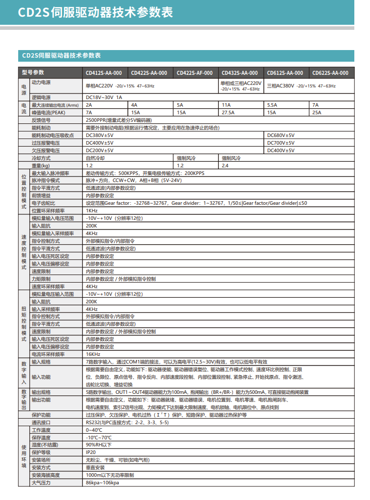 | 系列 | 規格型號 | 功率(W) | 供電電壓 | 連續輸出電流(rms)(A) | 峰值電流(A) | 控制模式 |