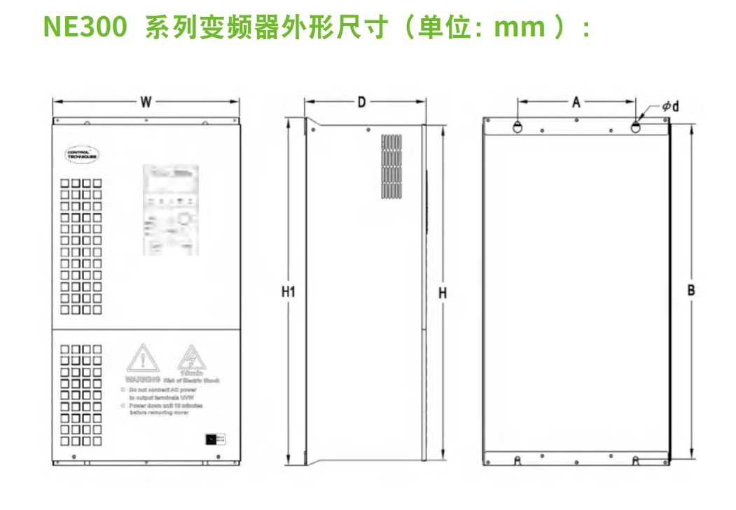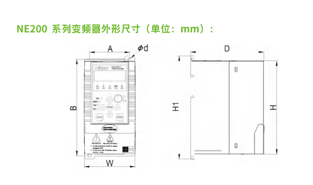NE200 系列變頻器型號及外形尺寸表(單位mm):