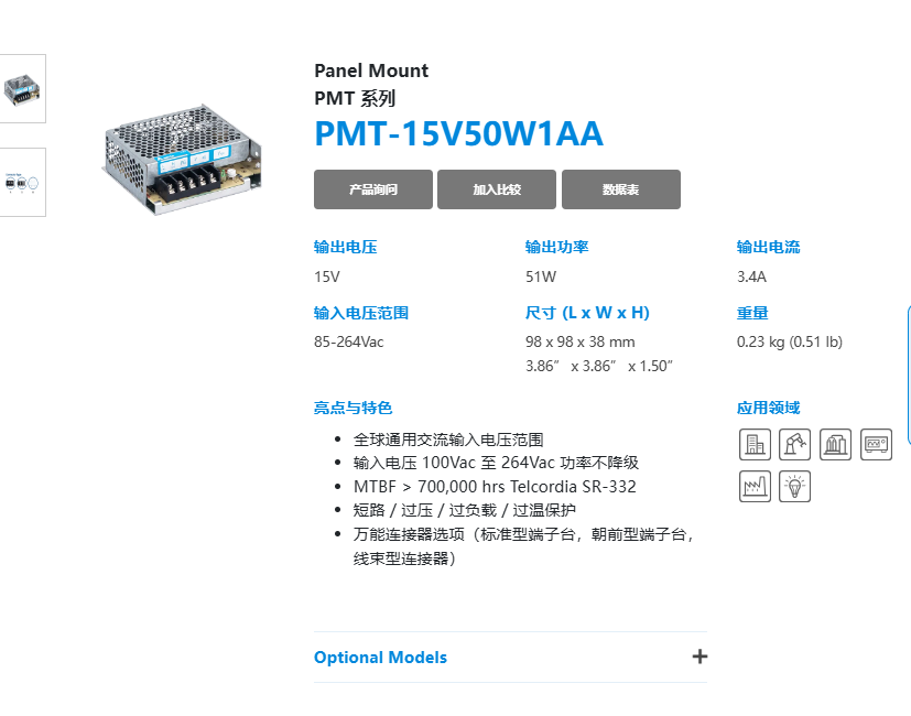 | 輸出 | PMT-15V35W2BA | PMT-15V50W2BA | PMT-15V75W2BA | PMT-15V100W2BA | PMT-15V150W2BA | PMT-15V150W2CA | |