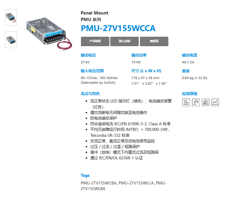 流正常狀態 LED 指示燈(綠色)、電池接反報警(紅色) 遇交流斷電無間隔切換至電池操作 防電池接反防御 符合諧波電流 IEC/EN 61000-3-2, Class A 標準 平均無故障運行時間 (MTBF) > 700,000 小時,Telcordia SR-332 標準 交流正常、直流正常及低電池信號監控 對過壓 / 過流 / 過溫 / 短路防御 緩沖(放電)模式下內置式過流及短路保 通過 IEC/EN/UL 62368-1 認證