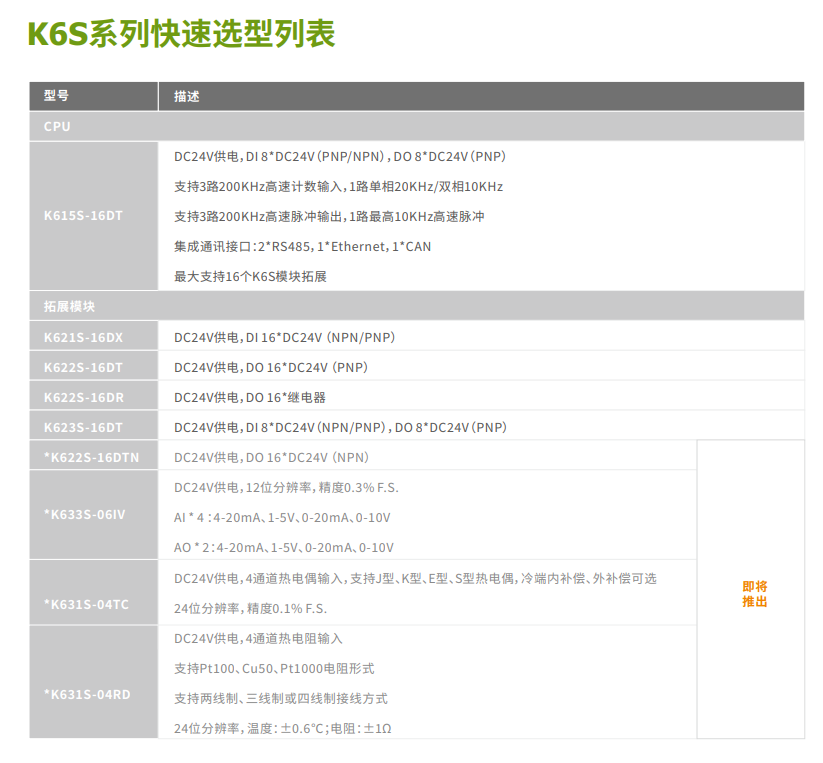| K615S-16DT | DC24V | 8 | 8 | ZUI大16 | HSCO | HSC1 | HSC2 | HSC3 | 通道0 | 通道1 | 通道2 | 通道3 | 1*Ethernet1*CAN2*RS485 | 75.15*38*106 |