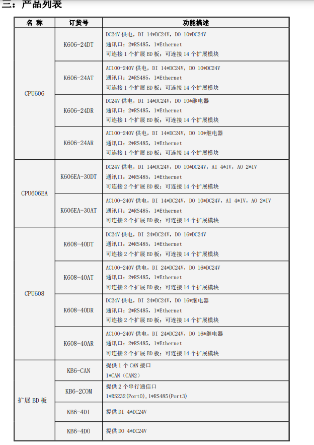 | K606-24DT | K606-24AT | 14 | 10*DC24V | 無 | 1個 | 4(單相: 2ZUI高200KHz,2*ZUI言20KHz雙相: 2*ZUI高200KHz,2”ZUI高10KHz) | 4(3*ZUI高200KHz1*ZUI高10KHz) | 2*RS485、1*Ethernet | 14個(支持K6/K5系列擴展模塊、兩者可選擇單一系列連接使用,或者兩系列混合連接使用) | 128*114*76 | |